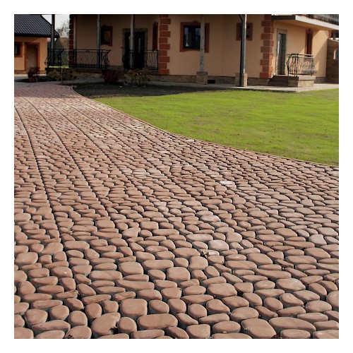 Kamień Sjeneński® to dwie płyty utworzone z nieregularnych owalnych kamieni związanych ze sobą systemem połączeń. Zadaniem tych połączeń jest zachowanie odpowiednich odległości między poszczególnymi kamieniami, nie zaś przenoszenie obciążeń, dlatego też występujące czasami ich pęknięcia nie stanowią wady. Kamień Sjeneński® to klejnot pośród ażurowych płyt ekologicznych. Stworzony został z myślą o najbardziej reprezentacyjnych dojazdach do garaży, chodnikach oraz przydomowych parkingach obciążanych ruchem samochodów osobowych i dostawczych. Rustykalna powierzchnia typu granit i trachit decydują o wyjątkowo naturalnym wyglądzie kamieni. W wielu indywidualnych ułożeniach stosuje się łamanie płyt na pojedyncze kamienie celem uzyskania pełnego efektu przypadkowości ułożenia oraz możliwości tworzenia łuków.