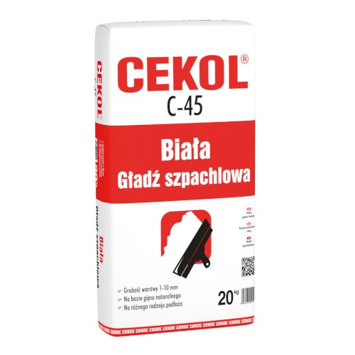 Cekol C-45 jest suchą mieszanką wyprodukowaną na bazie najwyższej klasy białego gipsu naturalnego, białych wypełniaczy naturalnych oraz szerokiej gamy dodatków uszlachetniających, modyfikujących, uplastyczniających, opóźniających wiązanie i zapewniających doskonałą przyczepność do podłoża (gipsowego, ceglanego, betonowego, gazobetonowego). Cekol C-45 jest doskonałym podkładem pod farby emulsyjne i akrylowe. Biała barwa pozwala na ograniczenie ilości wymalowań dla uzyskania pełnego efektu barwnego. Stanowi doskonały podkład pod tapety. Jest produktem nietoksycznym w użyciu i podczas eksploatacji, wykonanym w całości z naturalnych komponentów. Cekol C-45 nie żółknie pod wpływem światła.