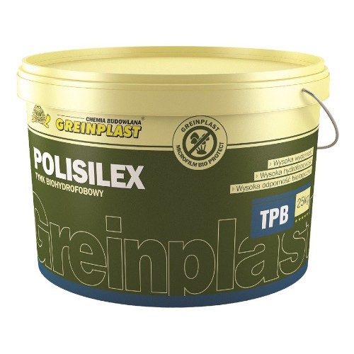 Tynk biohydrofobowy Greinplast TPB jest on produktem chroniącym przed mikroorganizmami, hydrofobowym sprawiającym, że jego powierzchnia jest nienasiąkliwa i samoczyszcząca. Ma znakomite parametry robocze ułatwiające nakładanie. Posiada system Greinplast Microfilm Bio Protect. Jest on do ręcznego wykonywania elewacji zewnętrznych. Może być stosowany na wszelkie typowe podłoża mineralne takie jak: beton, tynki cementowe, cementowo-wapienne oraz jako wyprawa tynkarska na warstwach zbrojonych siatką w systemach ociepleń GREINPLAST. Powierzchnie, na które będzie nakładany tynk muszą być bezwzględnie zagruntowane farbą podkładową GREINPLAST PP w kolorze zgodnym z kolorem tynku. Razem z farbą podkładową GREINPLAST PP jest integralnym elementem zestawu wyrobów w systemie ociepleń GREINPLAST EPS z cienkowarstwowym tynkiem GREINPLAST TPB (zgodnie z odpowiednią AT) oraz GREINPLAST MW (zgodnie z ETA). Wyrób dostępny w kolorach wg palety barw Producenta. Na życzenie klienta dostępna także inna kolorystyka realizowana w Systemie Barwienia Greinplast (SBG).